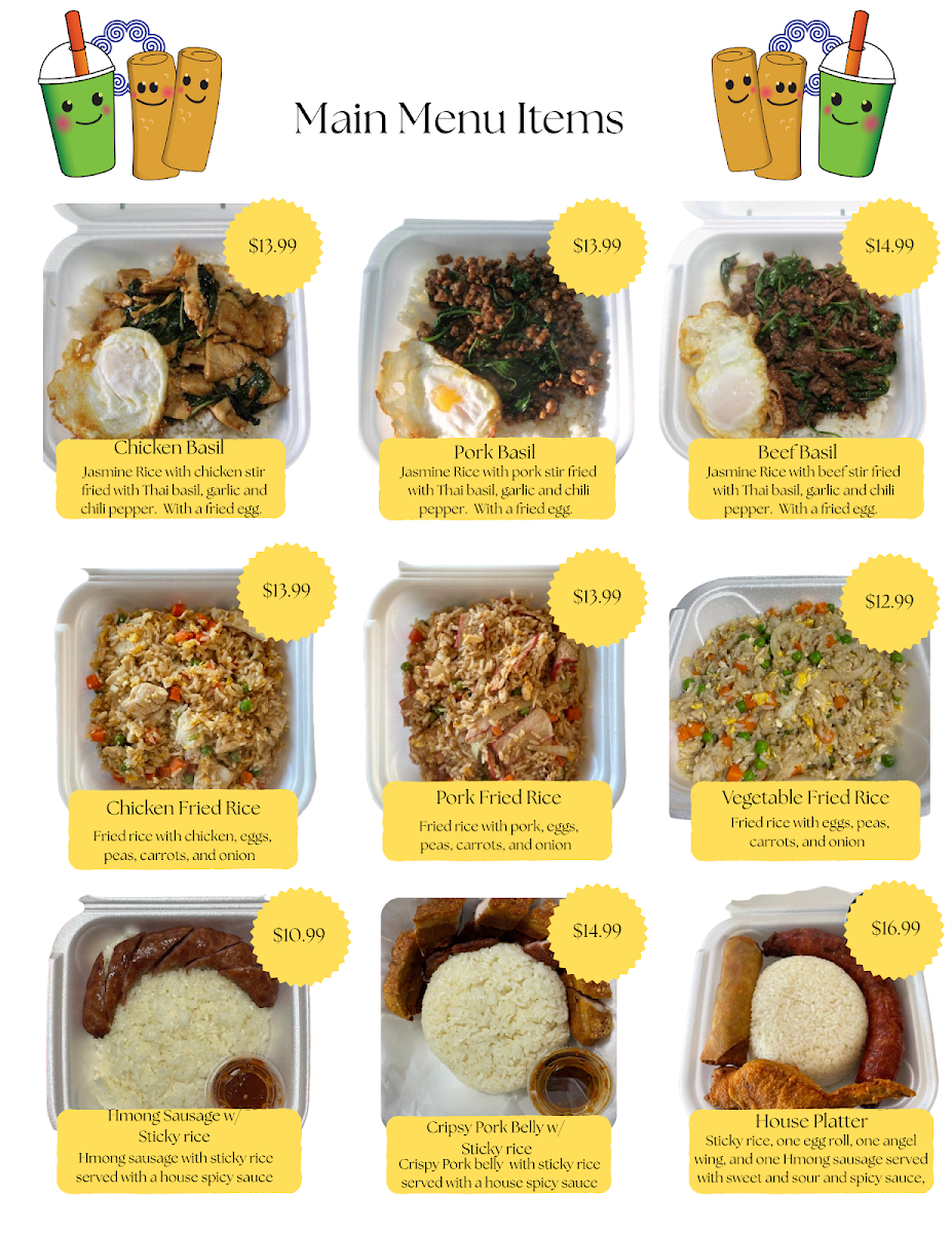 The main menu features a curated selection of authentic Thai-inspired dishes, with highlights such as the Hmong Sausage with Sticky Rice and Pork Belly. The beef and pork basil dishes are particularly enticing, offering a savory experience that leaves you craving more. Many reviewers have expressed their appreciation for the generous portion sizes, making it easy to share with family or save leftovers for later—a practice encouraged by Nichole Becker, who praises the hard-working owners for their personal touch and commitment to fresh, tasty food.